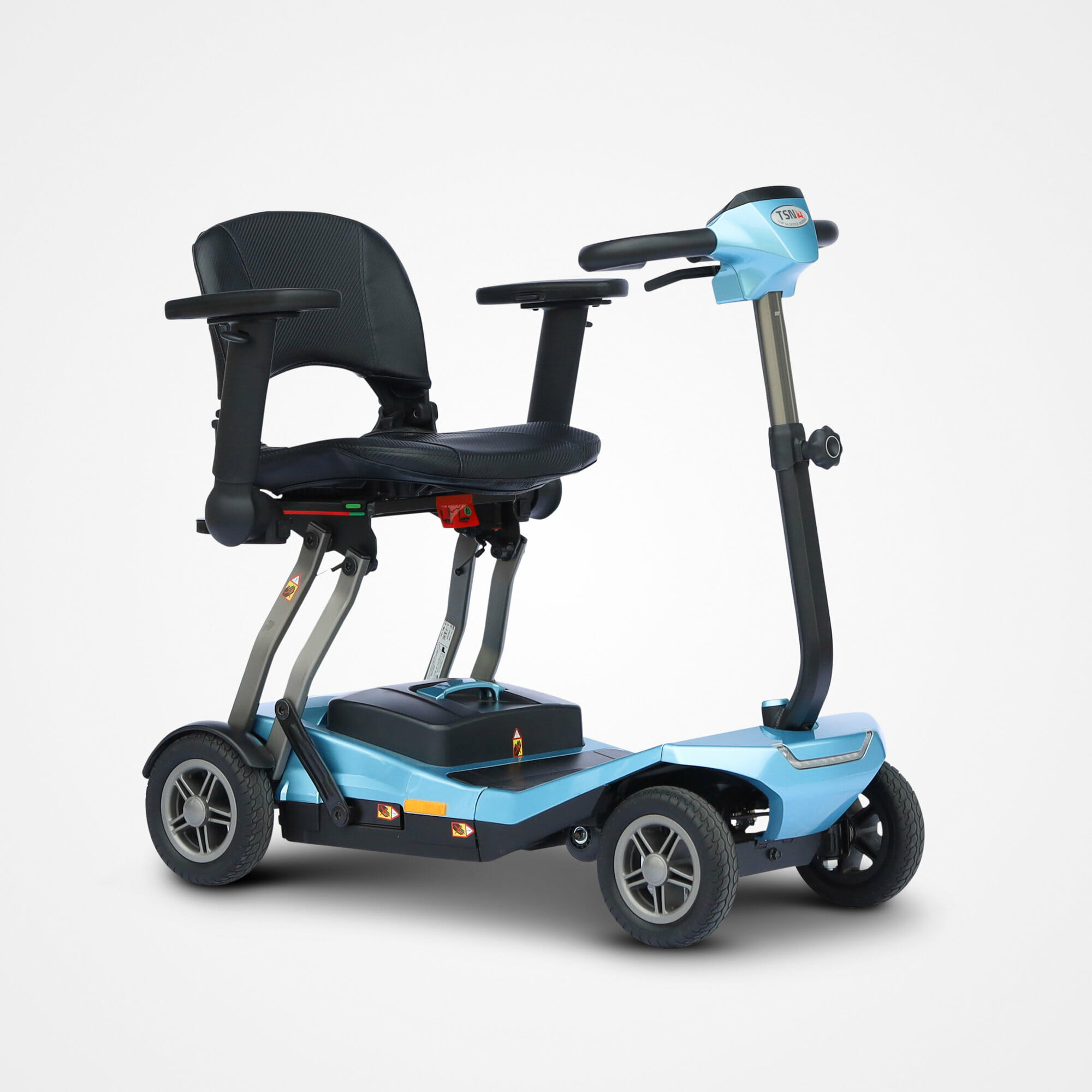 Letvægt 4 hjulet sammenklappelig elscooter med automatisk fold-ud og ind med fjernbetjeningen, yderst nem at tage med på tur, den kan tages med selv i en lille personbil. Den er godkendt til flytransport samt krydstogtskibe.